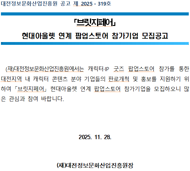 브릿지페어 현대아울렛 연계 팝업스토어 참가기업 모집공고 대전콘텐츠기업지원센터 2025-11-28 17:01 VIEW : 49 붙임1. 브릿지페어 현대아울렛 연계 팝업스토어 참가 지원사업 모집공고.hwp (91.5K) : 8 붙임2. 현대아울렛 연계 팝업스토어 참가 신청서.hwp (67.0K) : 6 목록으로