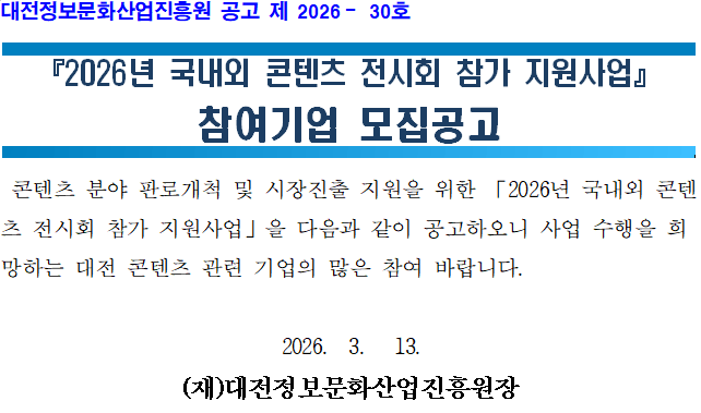 2026년 국내외 콘텐츠 전시회 참가 지원사업 참여기업 모집공고 대전콘텐츠기업지원센터 2026-03-13 17:42 VIEW : 59 붙임1. 2026년 국내외 콘텐츠 전시회 참가 지원사업 안내서.hwp (97.0K) : 1 붙임2. 2026년 사업관리시스템(PMS) 사업신청 매뉴얼.pptx (1.1M) : 1 목록으로